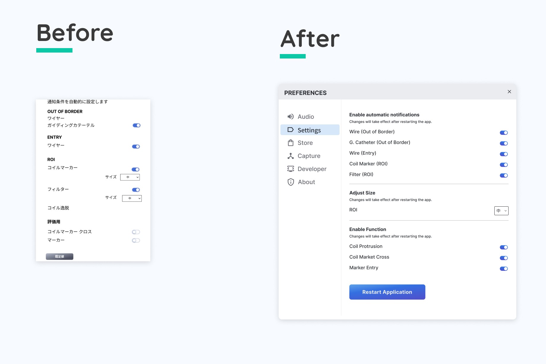 I refined the settings panel after reviewing client changes, including a new size adjustment control. I also challenged the removal of the “Save Changes” button, identifying inconsistency with expected UX patterns. Since changes would require a restart to take effect, I proposed replacing it with a “Restart App” button and a supporting message to clarify system behaviour.