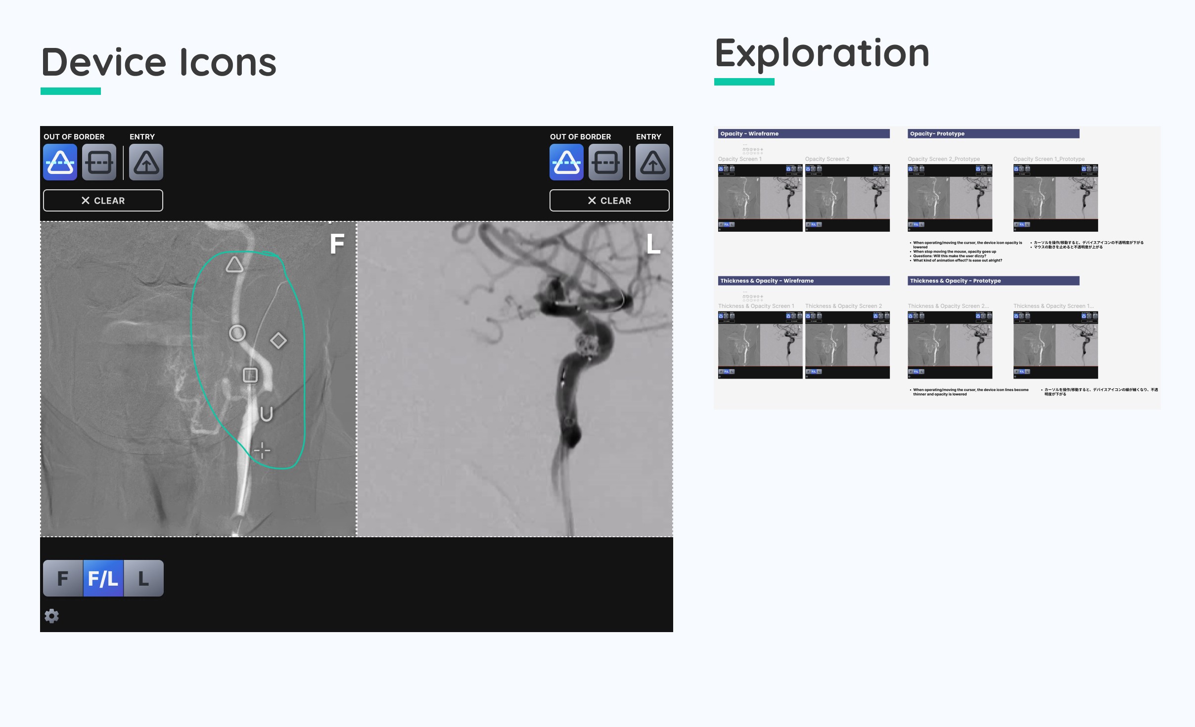 Throughout the project, I was regularly asked to refine existing device icons and design new ones. I explored variations in opacity and interaction states. For example, reducing icon opacity during active mouse movement to minimize visual distraction during procedures. The final designs improved visibility through thicker outlines and adjusted opacity, and were adopted by the client.