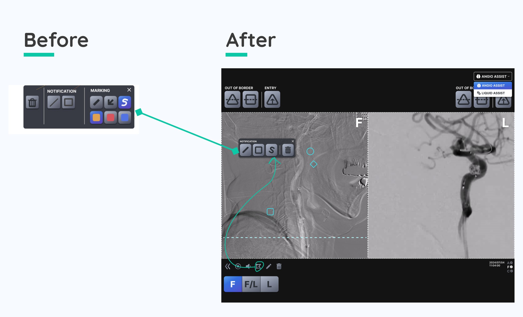 One key discussion involved merging the “Notification” (ROI) function with the drawing/markup tool. I raised concerns around usability: the feature lacked color customization and was accessed via a pen icon, an interaction pattern typically associated only with drawing, making the functionality unclear. I proposed introducing a dedicated notification icon with its own panel to improve discoverability and clarity.