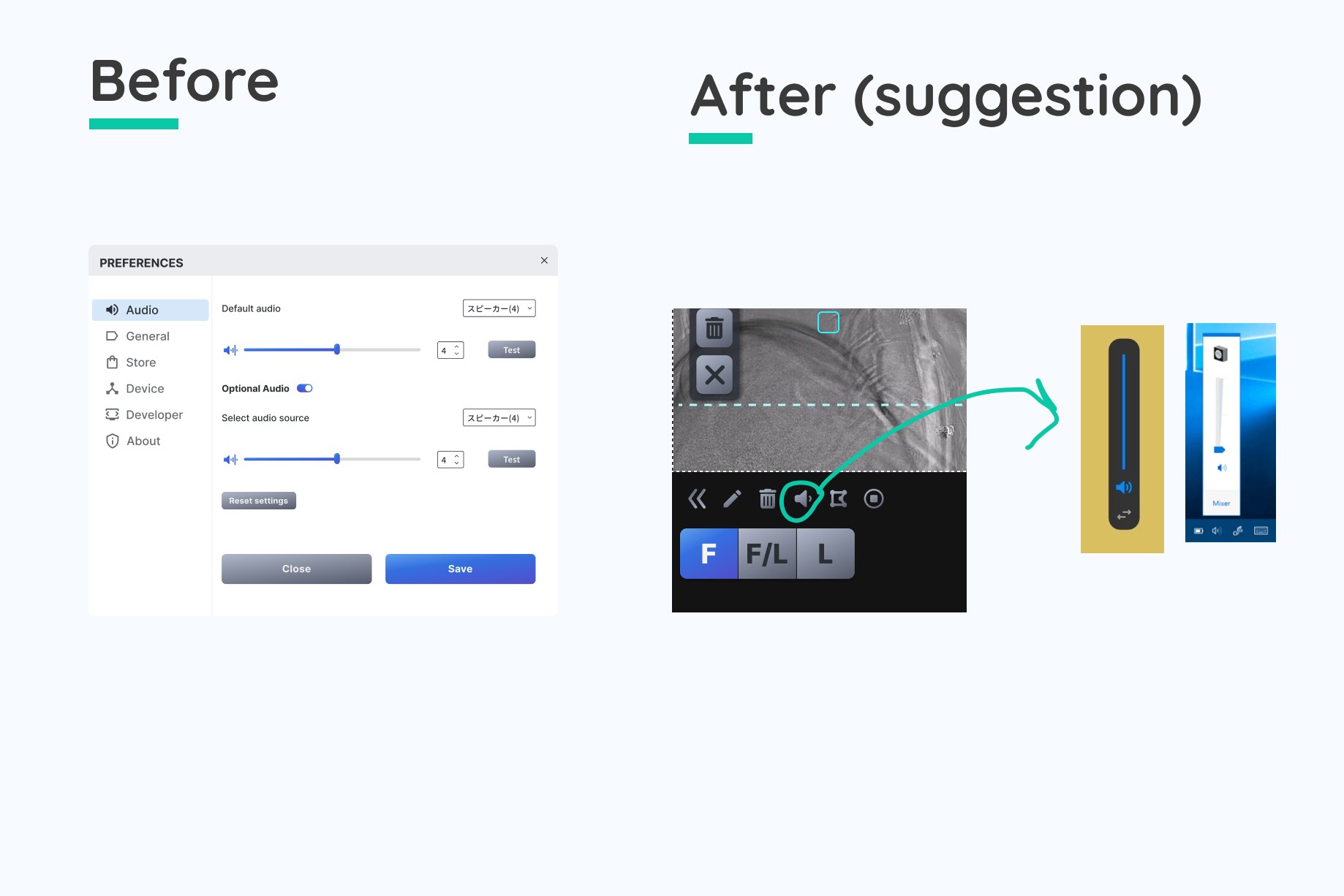Volume controls were initially embedded within the preferences menu. I proposed a more intuitive interaction where clicking the volume icon reveals a quick-adjust slider, with an optional link to full audio settings. This approach aligns with user expectations for immediate volume control while preserving access to advanced options. The solution was confirmed as technically feasible.