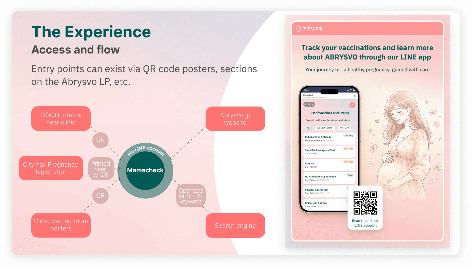 Target pregnant women early in their pregnancy journey by leveraging LINEa platform they already use, through a LINE LIFF app that combines vaccine tracking with accessible, stage-based educational content, increasing awareness of RSV prevention and the availability of Abrysvo.