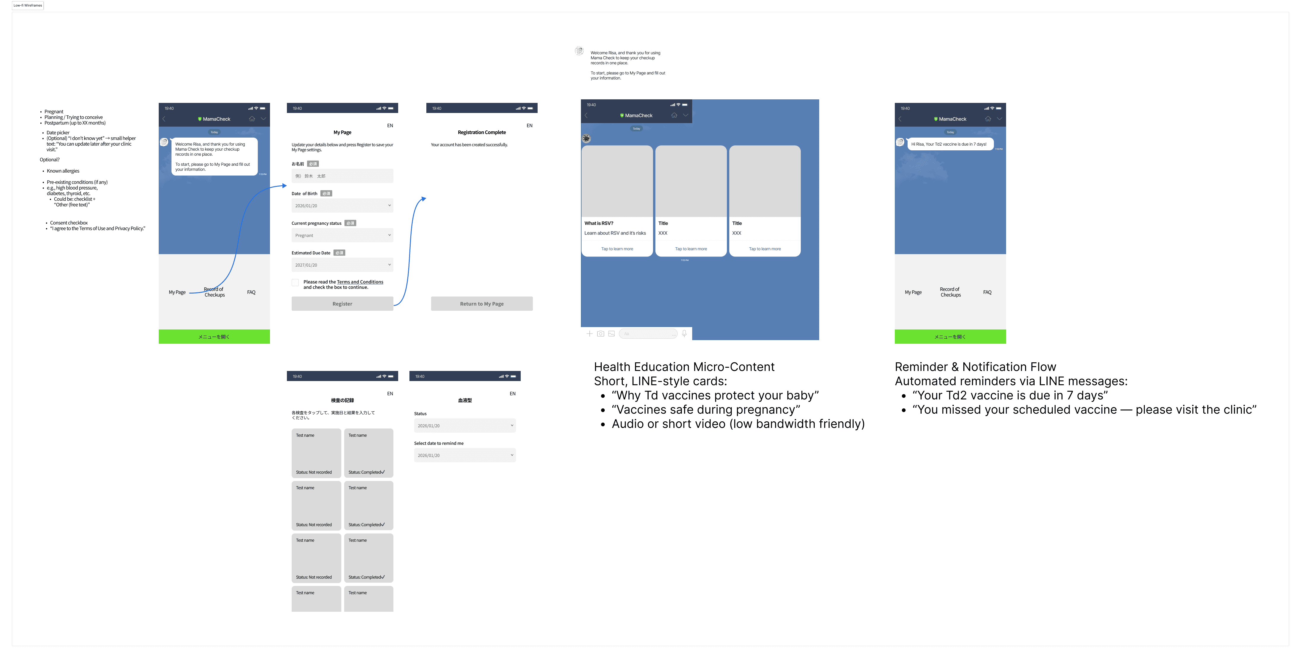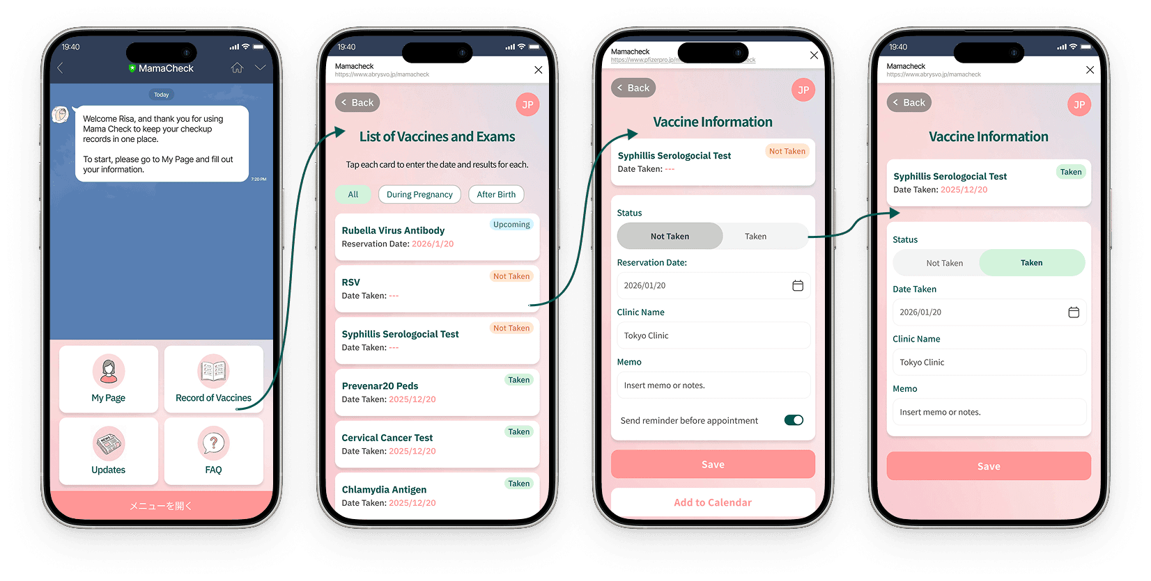 While the physical handbook cannot be modified, this creates an opportunity to extend its value through supplementary touchpoints. I decided to explore the idea of a digital checkup-record tool built as a LINE LIFF app (a web-based application that runs inside the LINE interface), allowing pregnant women to track immunisations and tests in a personalised way within their trusted LINE environment, accessed via a QR code insert alongside the handbook.