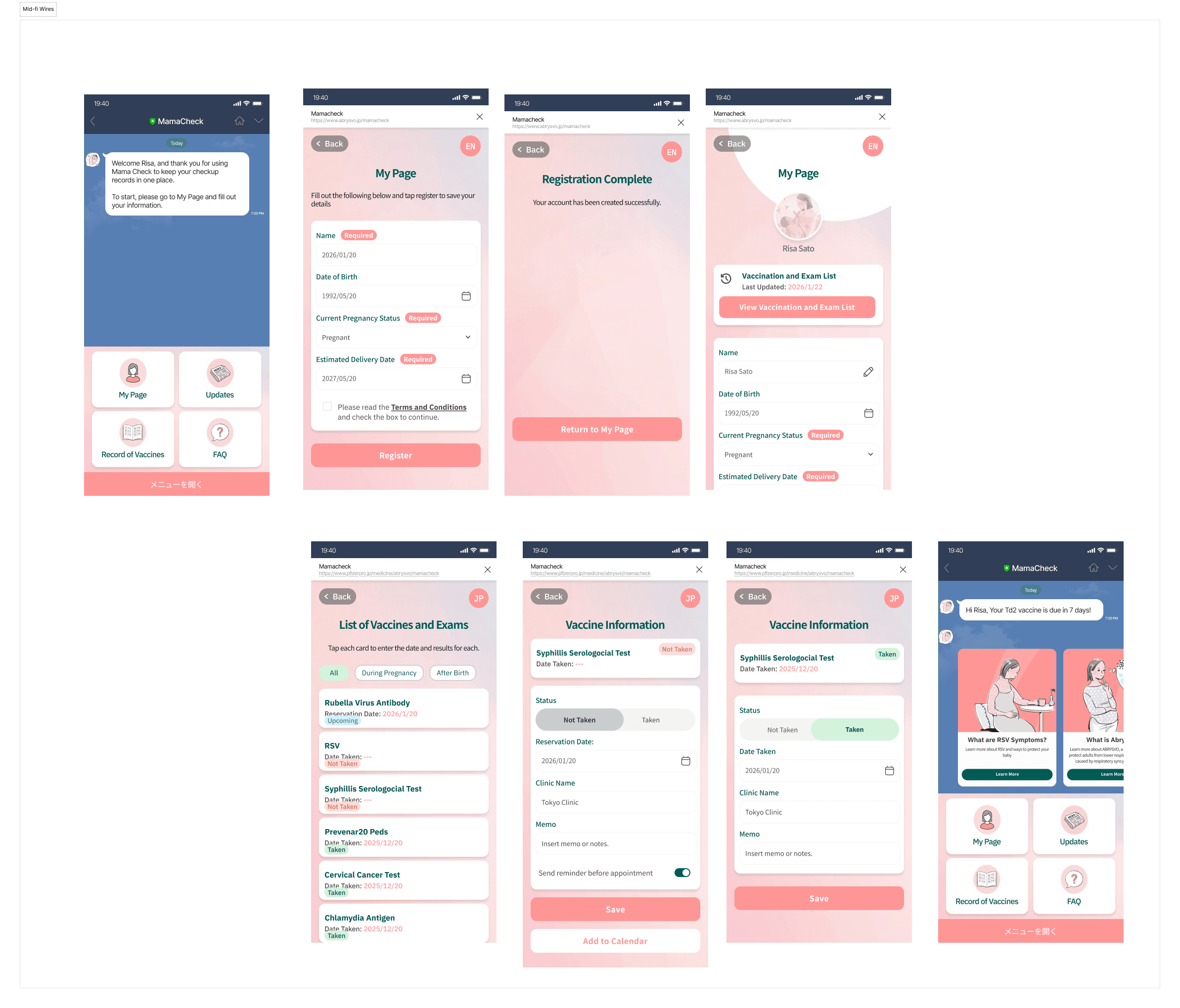 First, I created low-fidelity wireframes to map out the necessary screens and features. Once the structure was confirmed, I applied branding, including colour and imagery, to develop the higher-fidelity designs. I also gave the app a temporary name, "Mamacheck".
