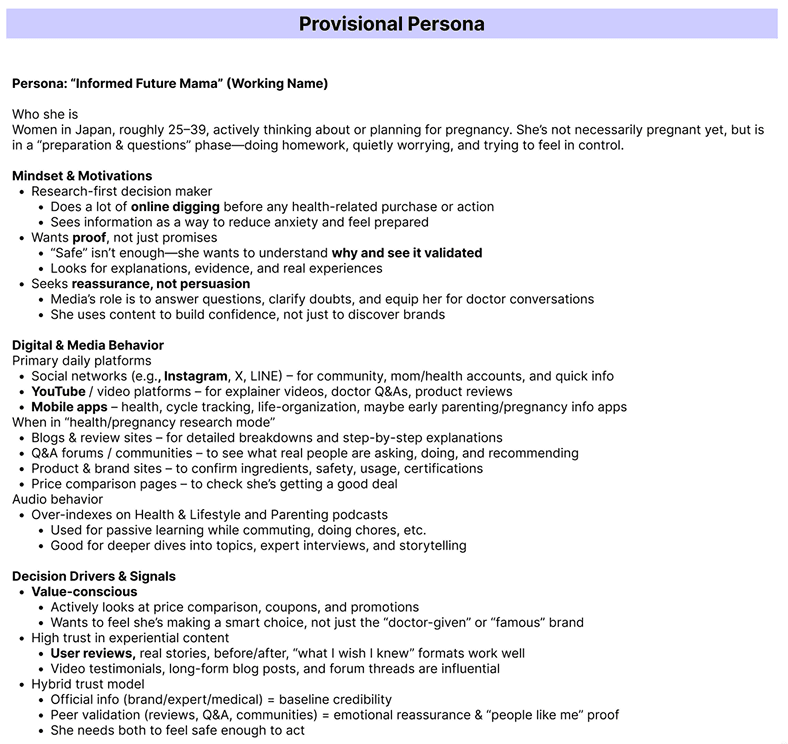 Given a one-week turnaround, I used company AI tools to develop a provisional persona to guide early design decisions. In parallel, I reviewed some of the most widely downloaded pregnancy tracking apps and conducted a competitive analysis to understand existing features, positioning, and gaps in the market.