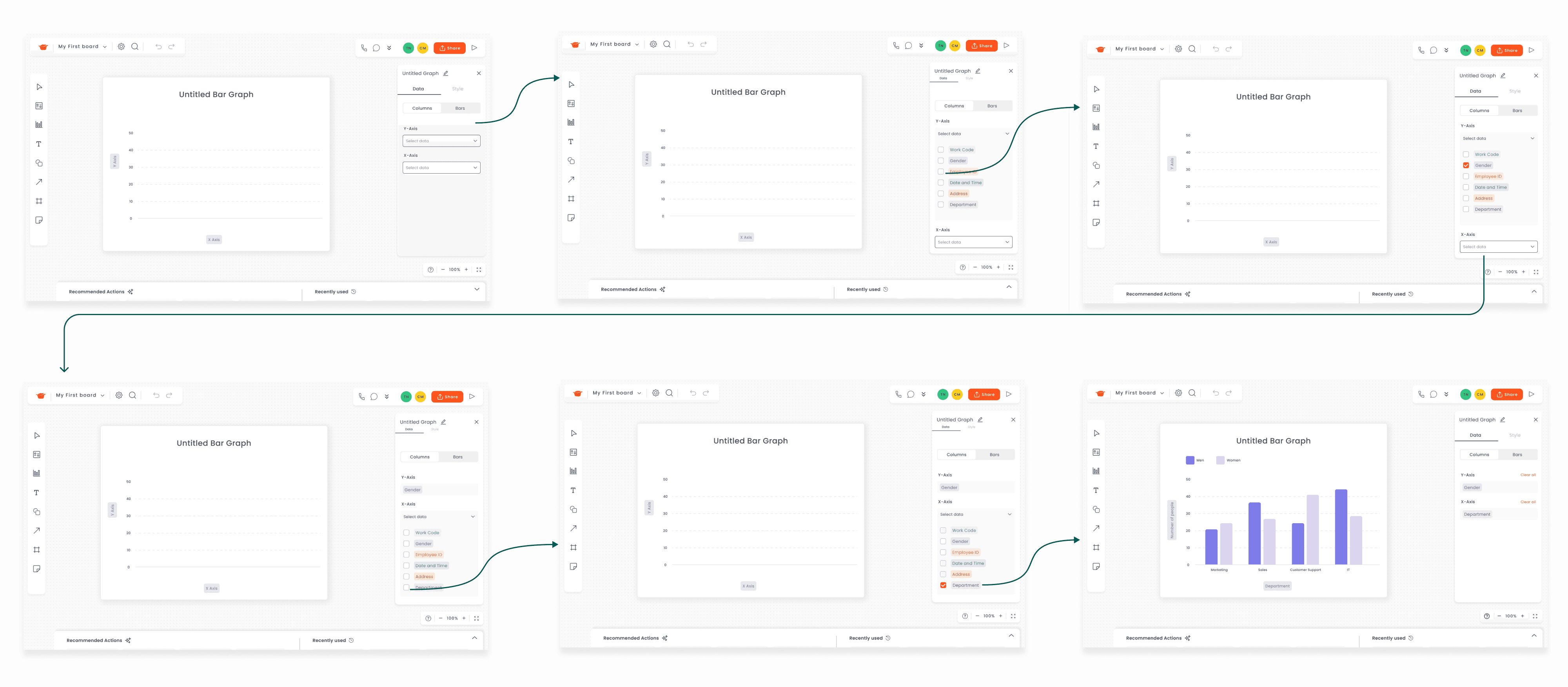 I created two key user flows to define the core experience: an end-to-end new user data visualization flow and a bar graph flow. These map how users move from onboarding to generating visualizations, helping align the team on key interactions.