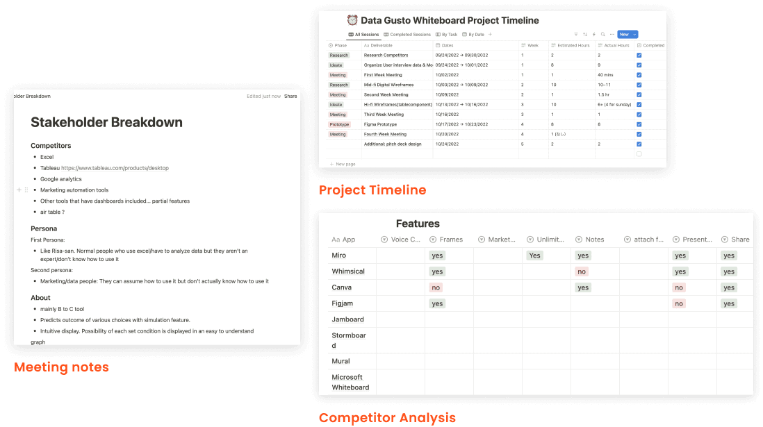 I kicked off the project by aligning with the CEO and CTO to define scope, requirements, and constraints, including a tight deadline for an upcoming pitch. Based on these discussions, I created a project timeline to keep the team on track and conducted a competitor analysis in Notion to inform the design direction.