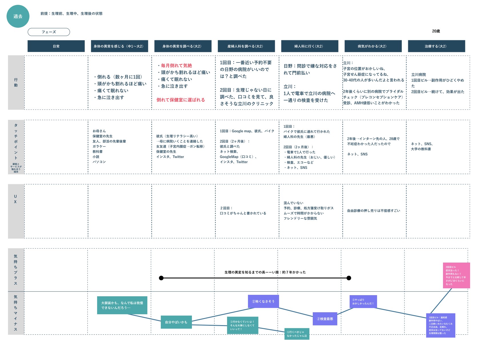 My teammate conducted interviews with women who had experienced symptoms of endometriosis or had been diagnosed. The findings were synthesized into journey maps, capturing key stages such as initial symptom awareness, sources of information (e.g., internet, friends, family), and first interactions with healthcare providers.