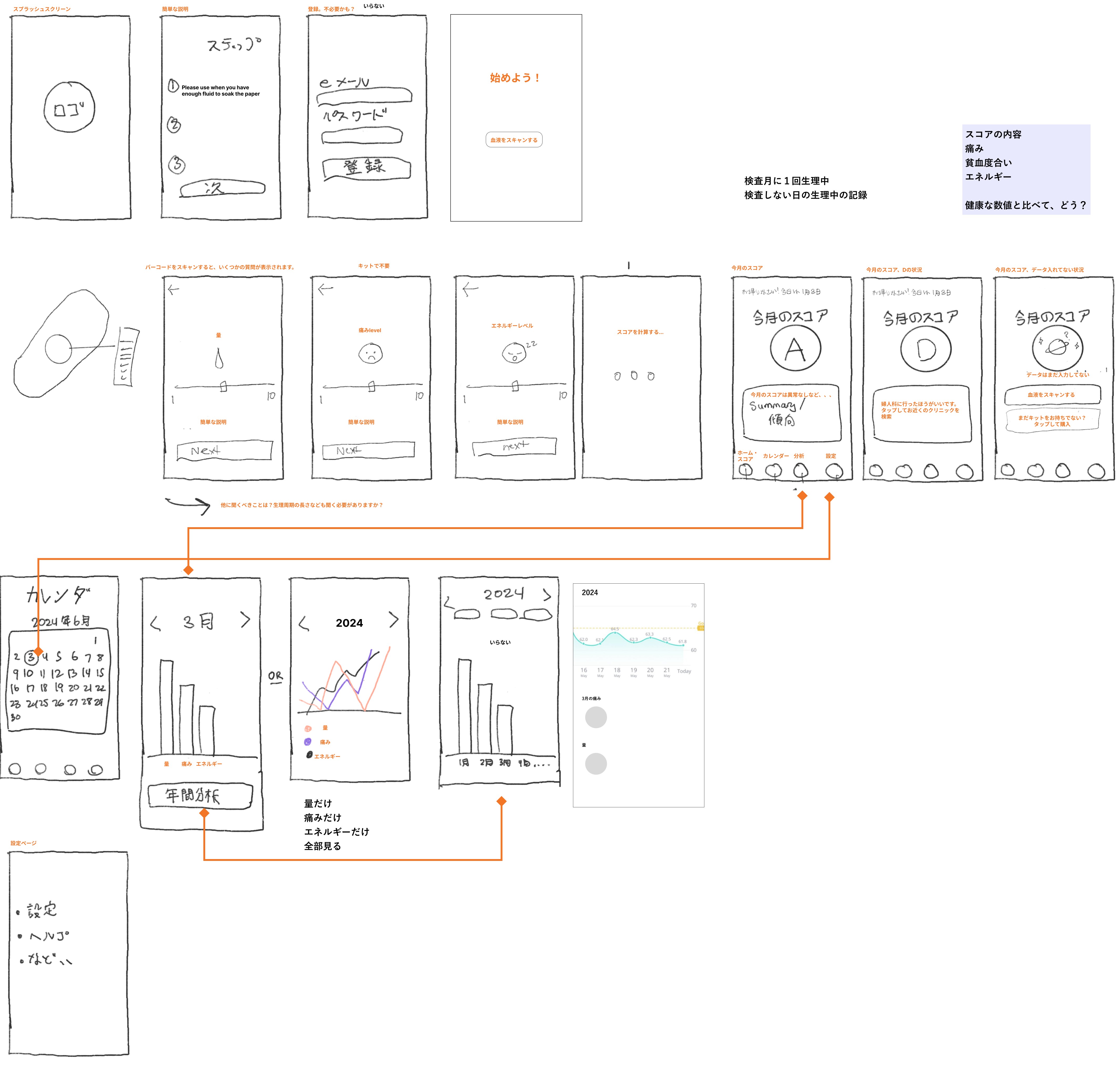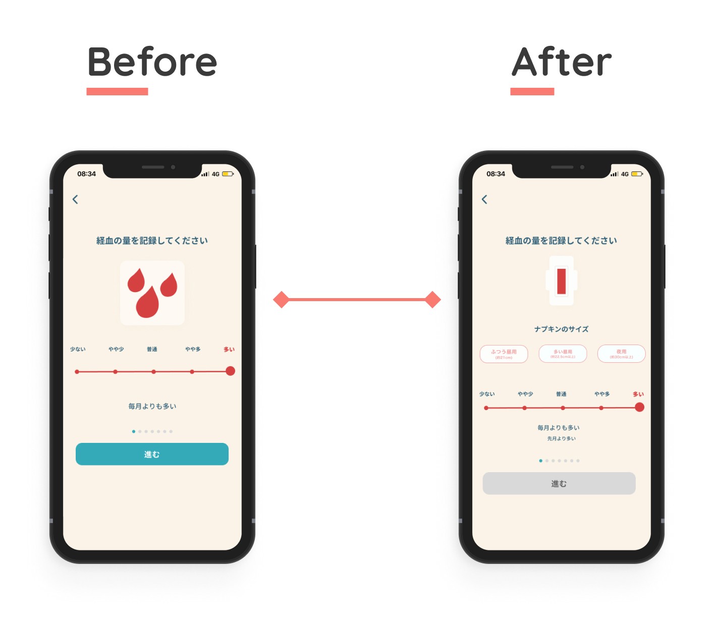 Initial concepts used abstract teardrop shapes to represent flow heaviness. This was replaced with period pad illustrations, enabling users to better relate their experience to real-world references. Additional options (e.g., daytime/nighttime pads) and contextual descriptions such as 「先月より多い」 were introduced to further support accurate input.