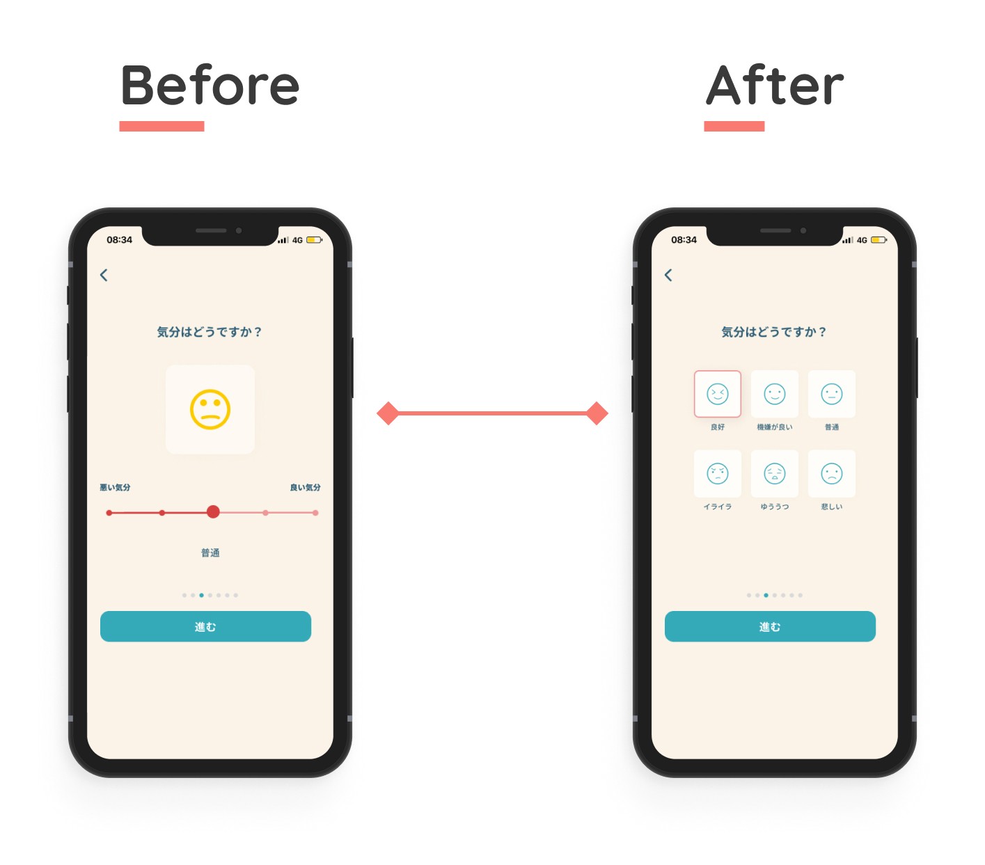 Originally designed as a slider from “poor” to “good,” this was replaced with selectable mood tags (e.g., depressed, irritated, content, happy). This allows users to capture more nuanced emotional states and improves the accuracy of collected data.
