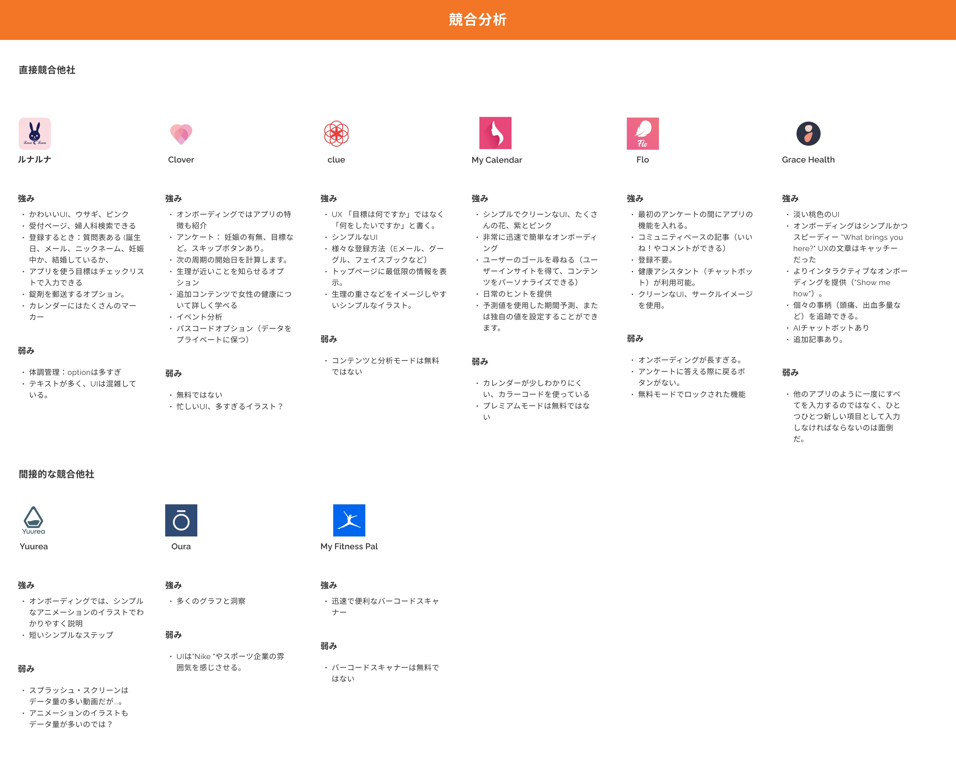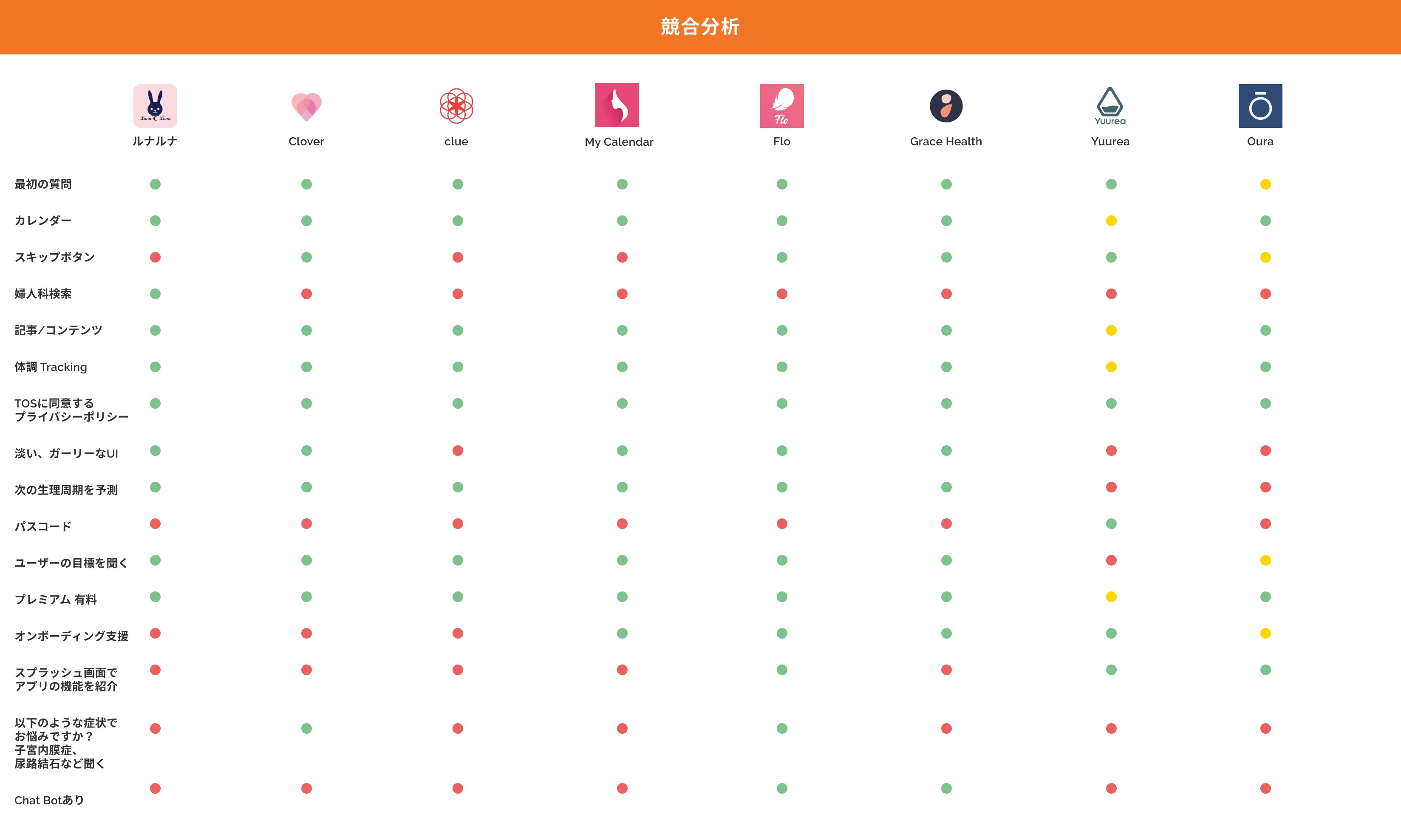 Feature comparison across apps, including calendar, mood tracking, and onboarding.